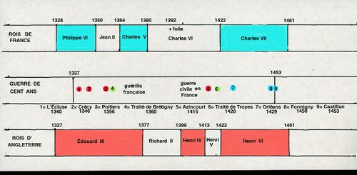 La deuxième période de la guerre est marquée par des succès français. Bertrand Du Guesclin, chef de l’armée française (connétable) refuse les batailles rangées mais harcèle sans trêve les Anglais (guérilla). Les Anglais perdent une grande partie de leurs possessions d’Aquitaine. La guerre semble terminée. Il fortifie également toutes les villes comme Paris.