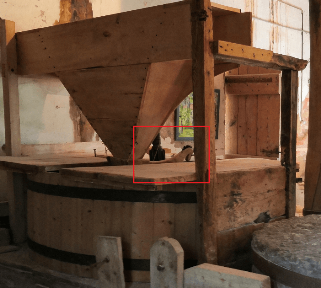 Pour faire fonctionner le moulin, on monte le levier, ce qui fait monter le banc, une poutre horizontale de chêne ou de hêtre qui prend appui sur de grosses pierres enfoncées dans le sol d’un côté et qui peut monter ou descendre du côté du levier.
