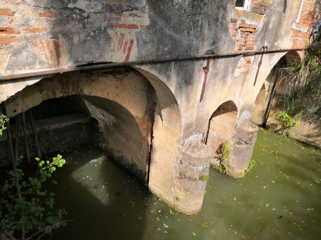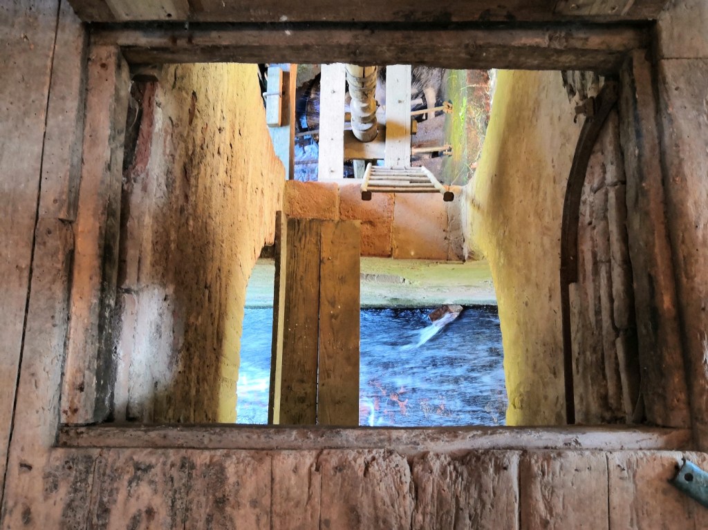 - le premier se trouve sous le plancher, constitué de 3 voutes (visibles depuis la passerelle), le sous-sol abrite les vannes, les rouets, les arbres et les leviers de tempure. La vanne centrale qui permet de vider le canal pour son entretien se trouve au niveau de la petite voute. Sous les 2 grandes voutes, les murs de barrage créent le volume d’eau et surtout la hauteur du niveau d’eau (4.60m) nécessaires à générer la puissance. L’épaisseur des murs se réduit en montant : 1.5m, 1.2m, 1m, puis 0.4m au niveau du canal.