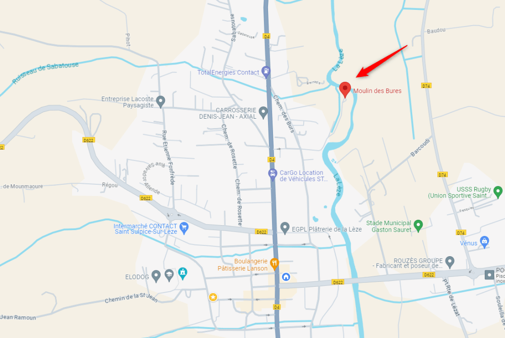 Le moulin est situé au 11 chemin du Moulin !? Il est situé au nord-est du village de Saint-Sulpice.