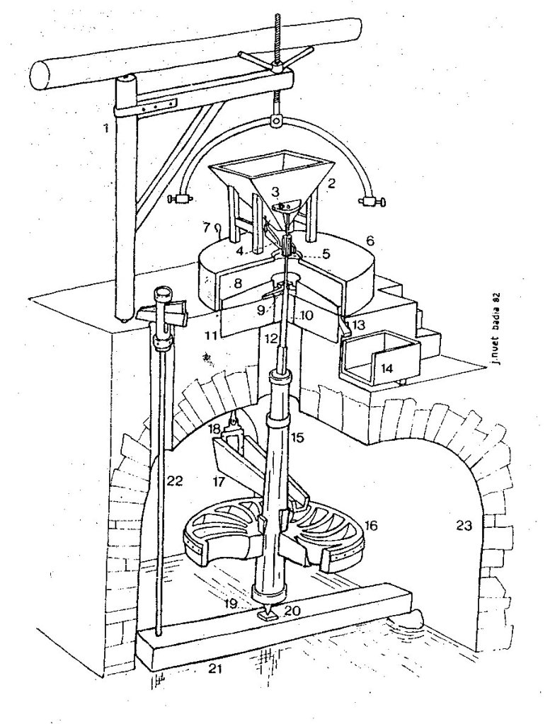 Lorsque la vanne est ouverte, l’eau fait tourner la roue qui fait tourner l’axe et la meule tournante si l’axe est remonté. Le levier permet ainsi d’écarter les meules et permet à la meule mobile située au dessus de tourner.