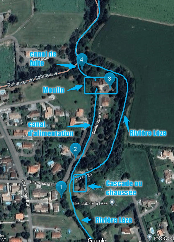 - Le canal de fuite permet le retour de l’eau du moulin à la Lèze.